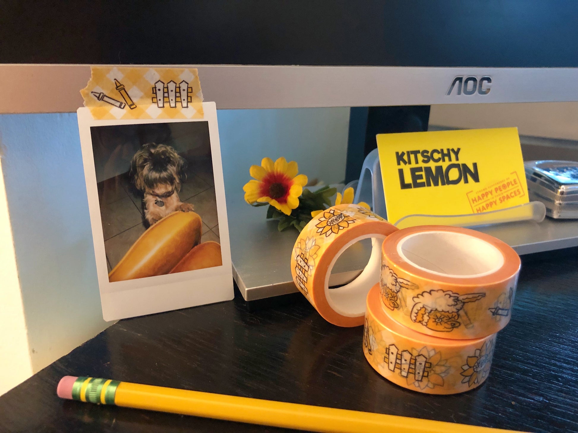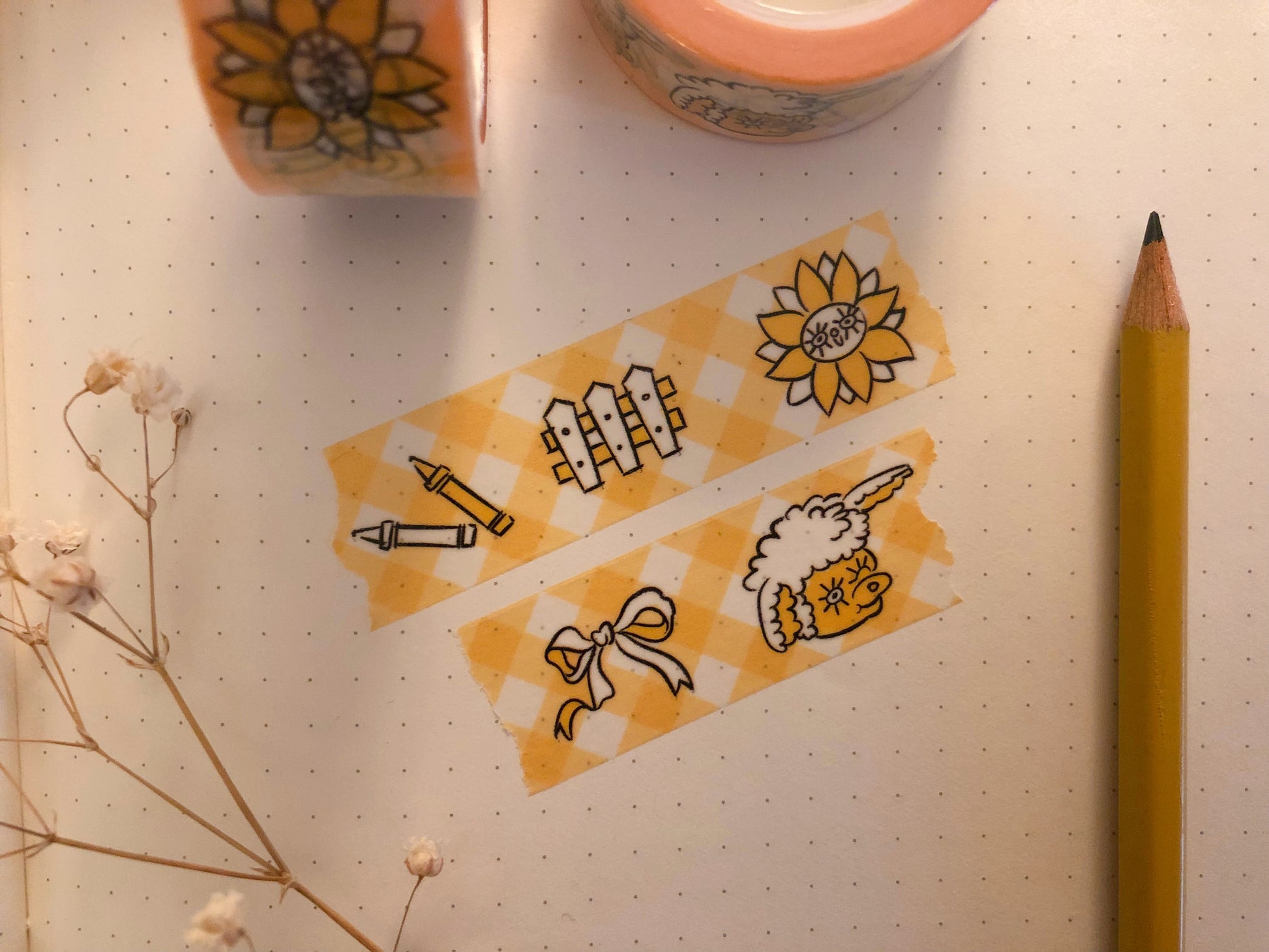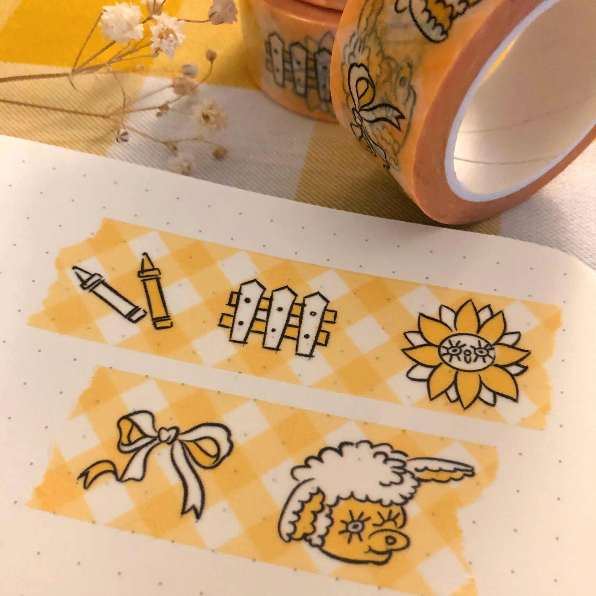 A plaid, yellow, & white background with the cutest doodles (crayons, white picket fence, sunflower, bow, & lamb)! This tape is perfect for decorating happy mail, scrapbooking, gift packaging, planners, and more.
